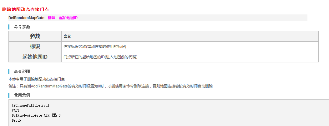 备注:只有当AddRandomMapGate的有效时间设置为0时,才能使用该命令删除连接,否则地图连接会按有效时间自动删除