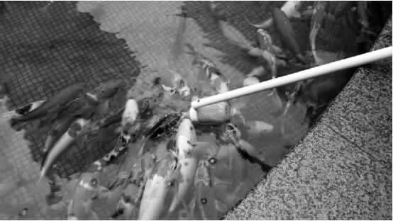 其实,这鱼儿吃的并不是真的奶,而是把鱼食放在奶瓶里,让鱼儿吸着吃。这样的喂法可真有意思。