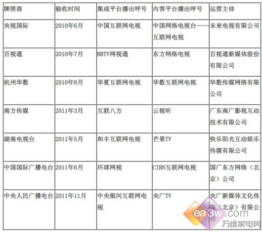 截止今朝,共颁布了七张互联网电视集成营业派司,均为广电系取得,这七家辨别是——CNTV(为请求主体)、杭州华数(浙江、杭州结合请求)、上海文广——百视通(上海为请求主体)、南边传媒(广东为请求主体)、湖南、中国国际和中心国平易近。