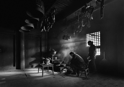 五是弄饭菜。家庭人口不多的农户,常在梭筒勾机上掛鼎罐煮饭,在火坑里架撑架、耳锅炒菜。一家人围在旁边,烤脚、舀饭、夹菜都方便。
